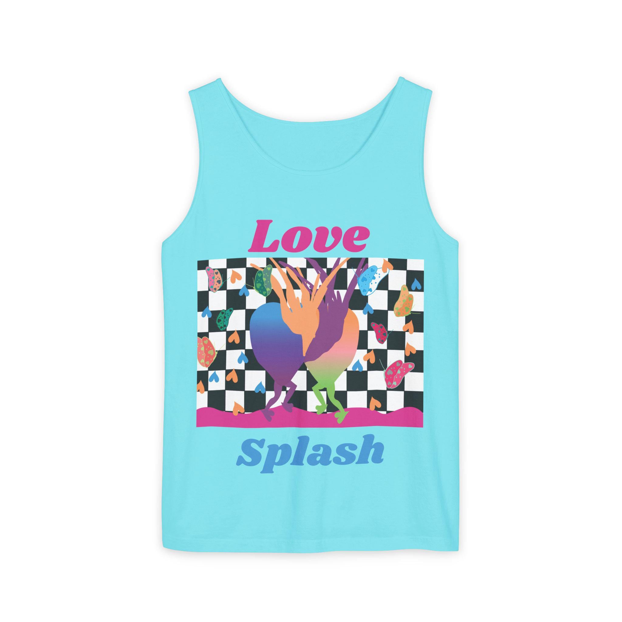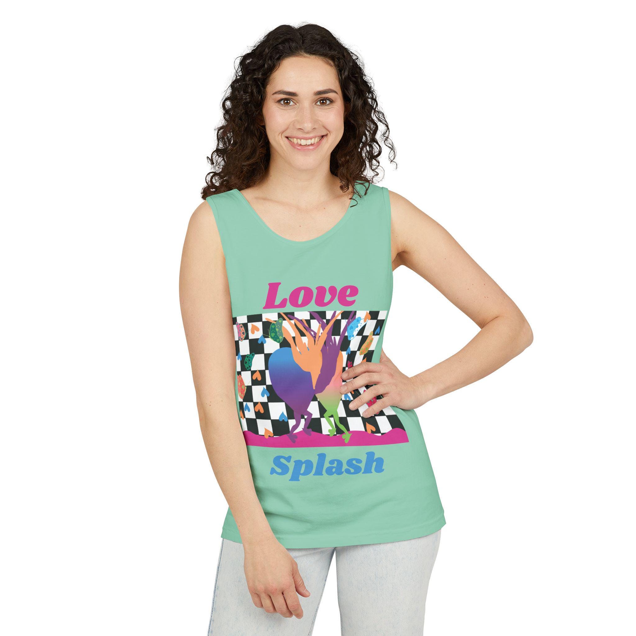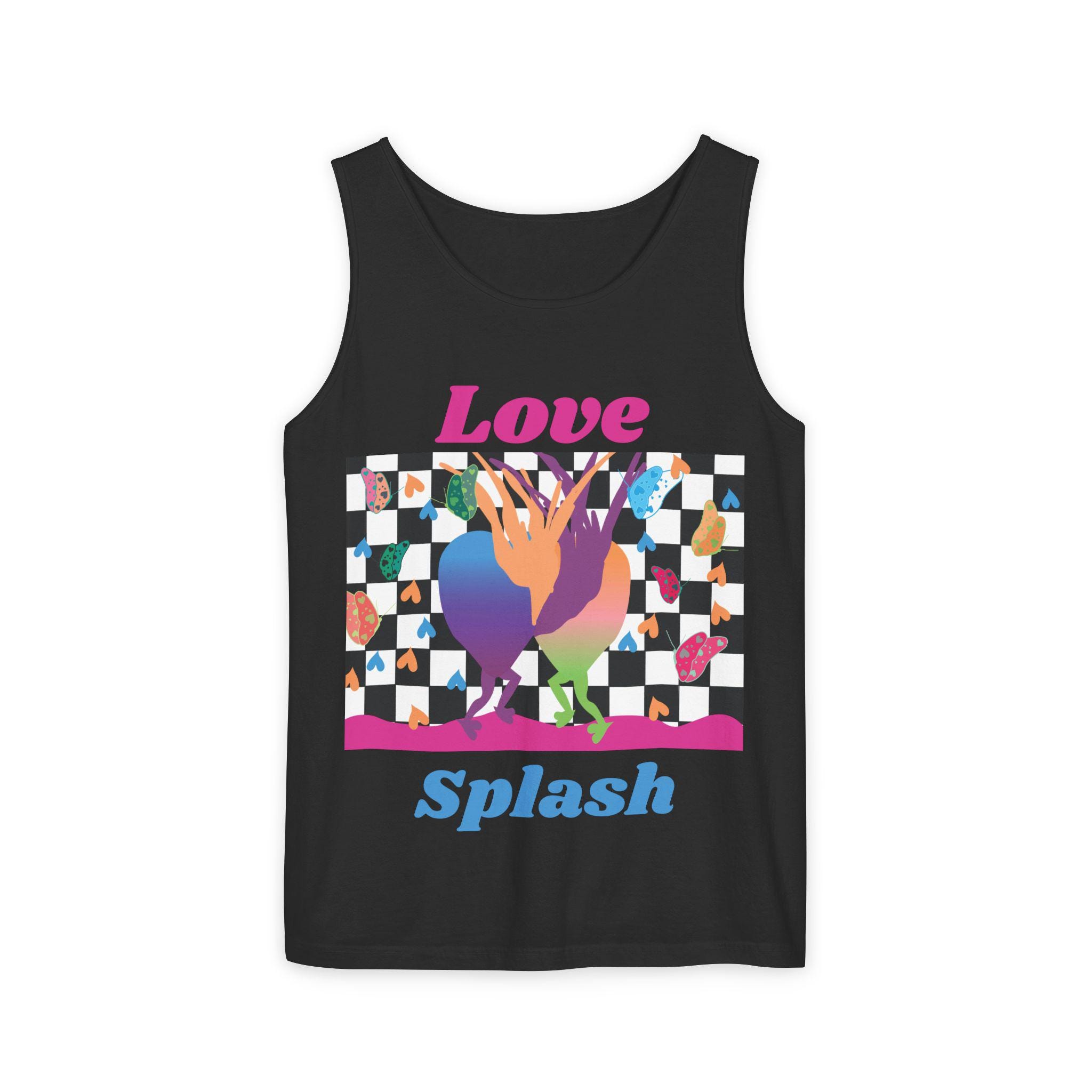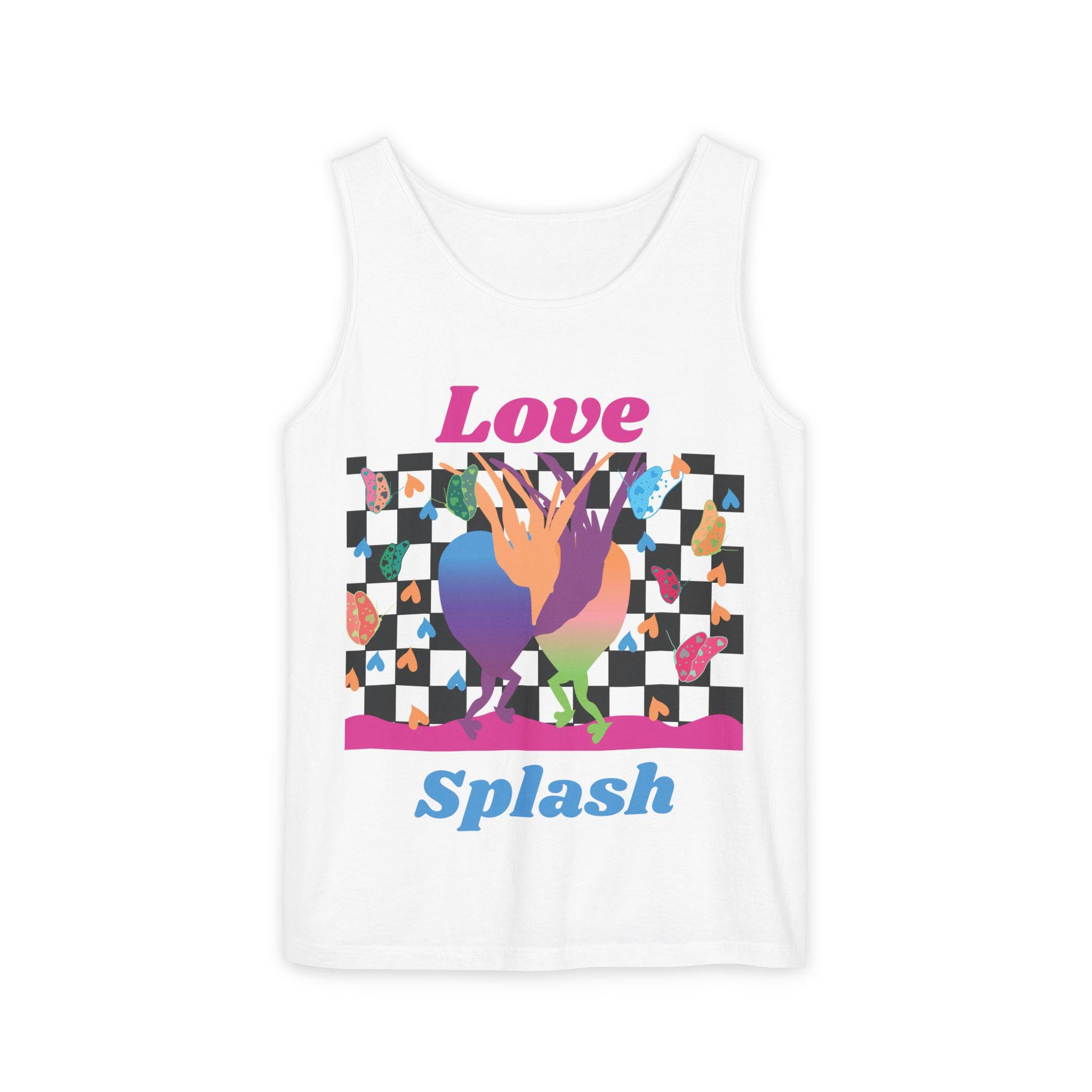 This relaxed-fit tank blends playful color with retro flair — a wearable snapshot of summer joy. A bold checkerboard backdrop frames a gradient heart and stylized splash graphic, while upbeat “Love” and “Splash” text adds an energetic, pop-art vibe. The garment-dyed cotton gives the surface a lived-in softness and subtle depth that makes the print feel integrated, not just applied. Easy to layer or wear solo, it brings a splash of bright optimism to beach days, festivals, or slow weekends with friends.