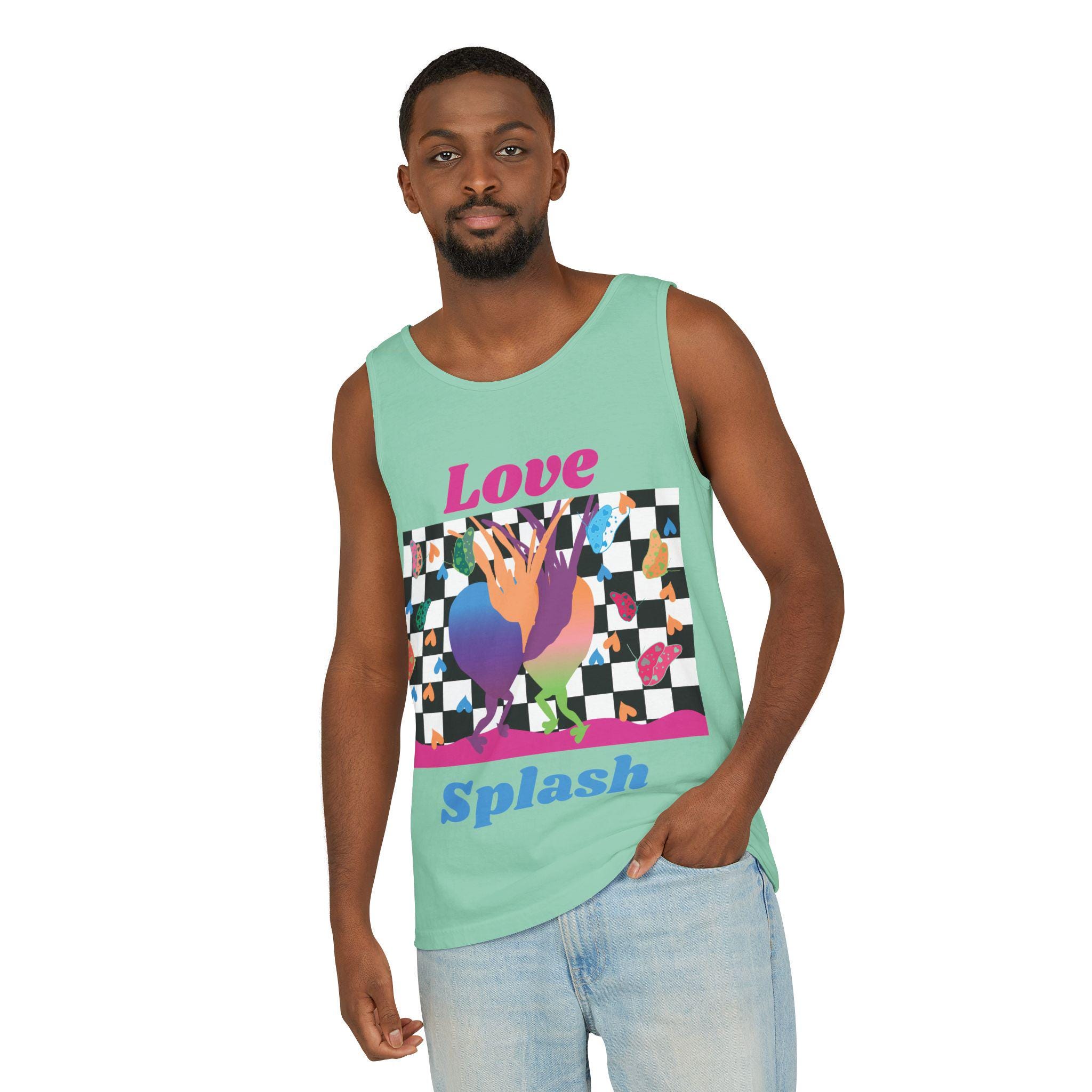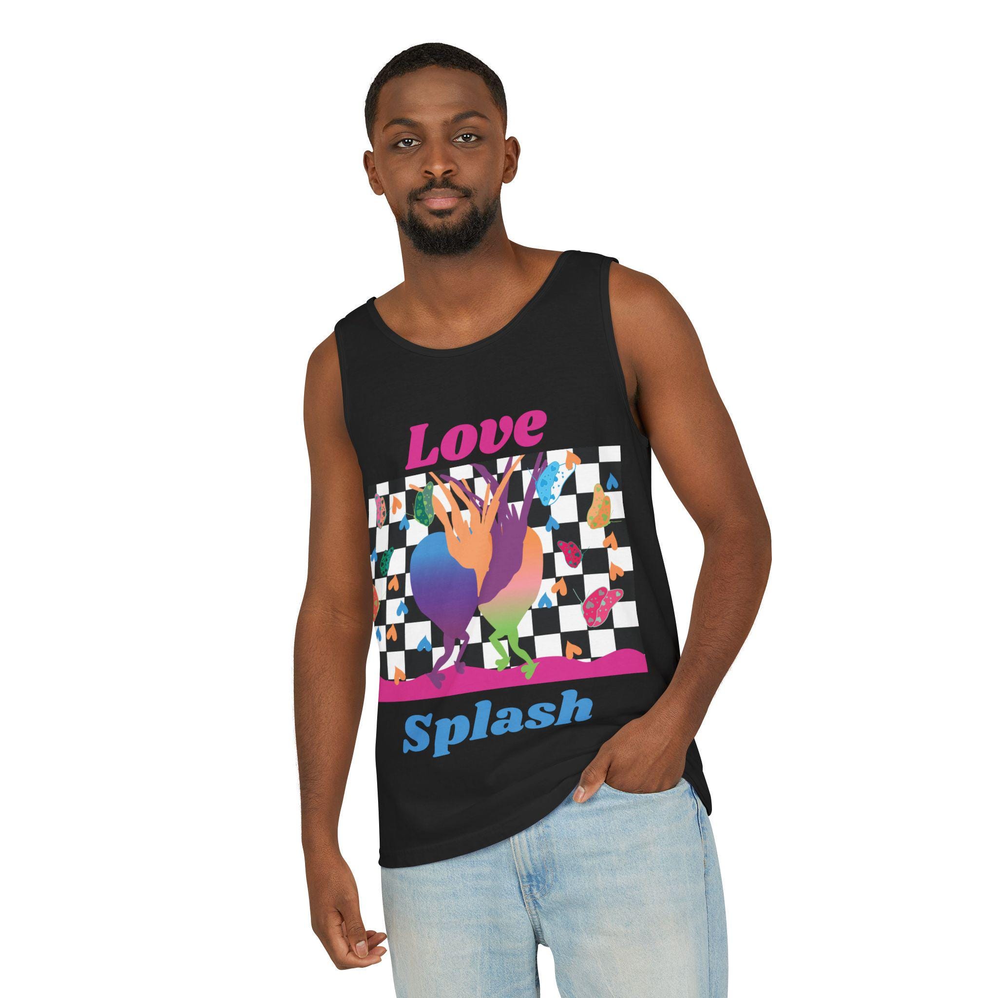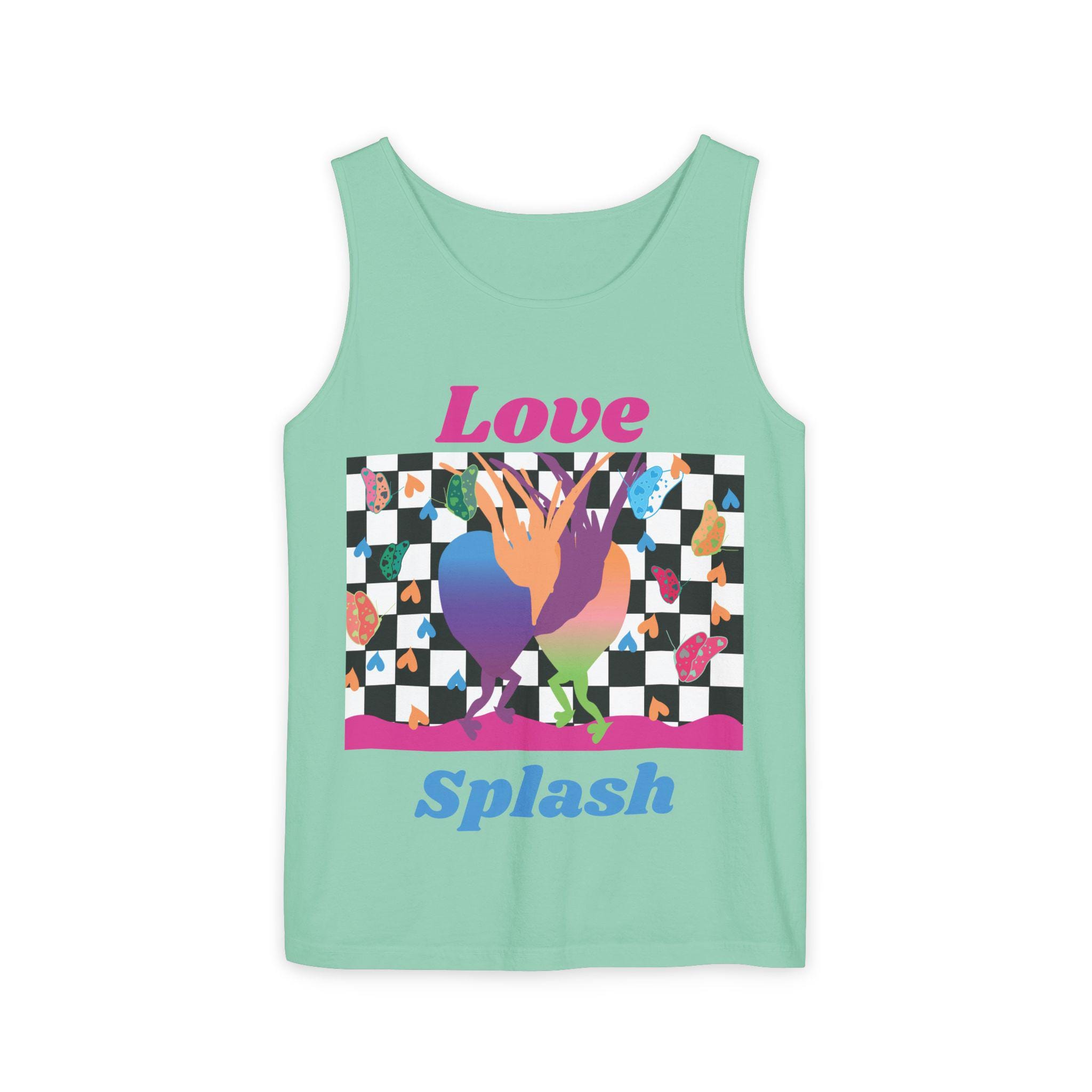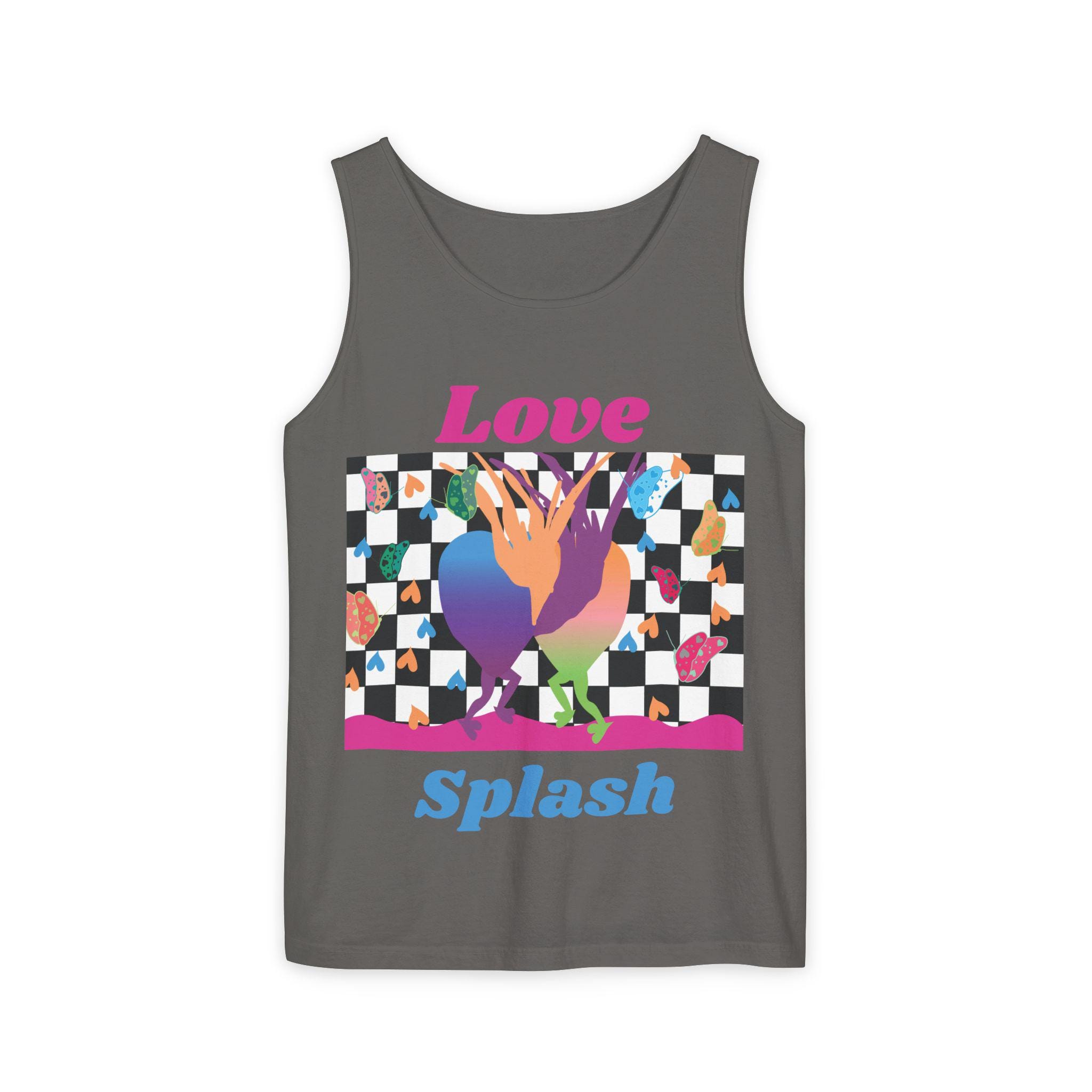 This relaxed-fit tank blends playful color with retro flair — a wearable snapshot of summer joy. A bold checkerboard backdrop frames a gradient heart and stylized splash graphic, while upbeat “Love” and “Splash” text adds an energetic, pop-art vibe. The garment-dyed cotton gives the surface a lived-in softness and subtle depth that makes the print feel integrated, not just applied. Easy to layer or wear solo, it brings a splash of bright optimism to beach days, festivals, or slow weekends with friends.