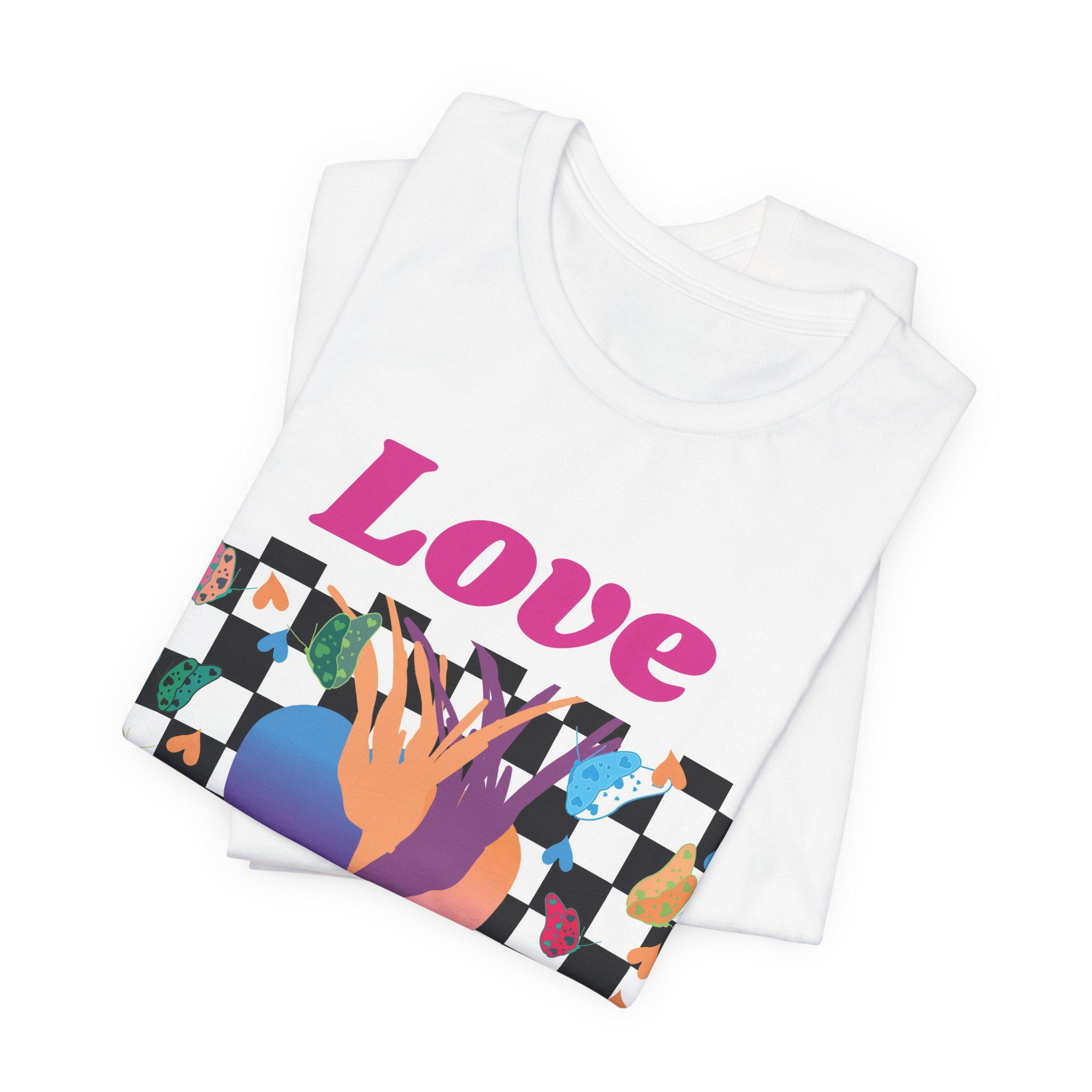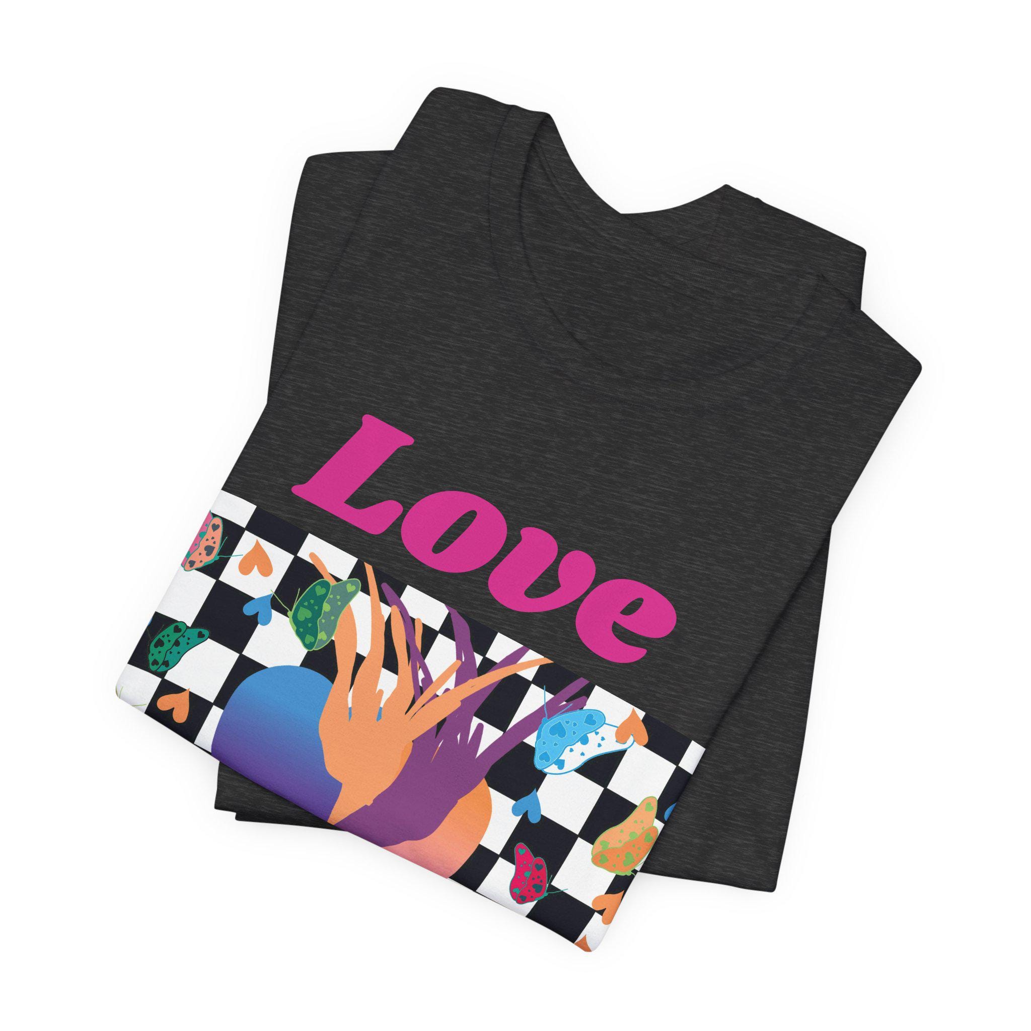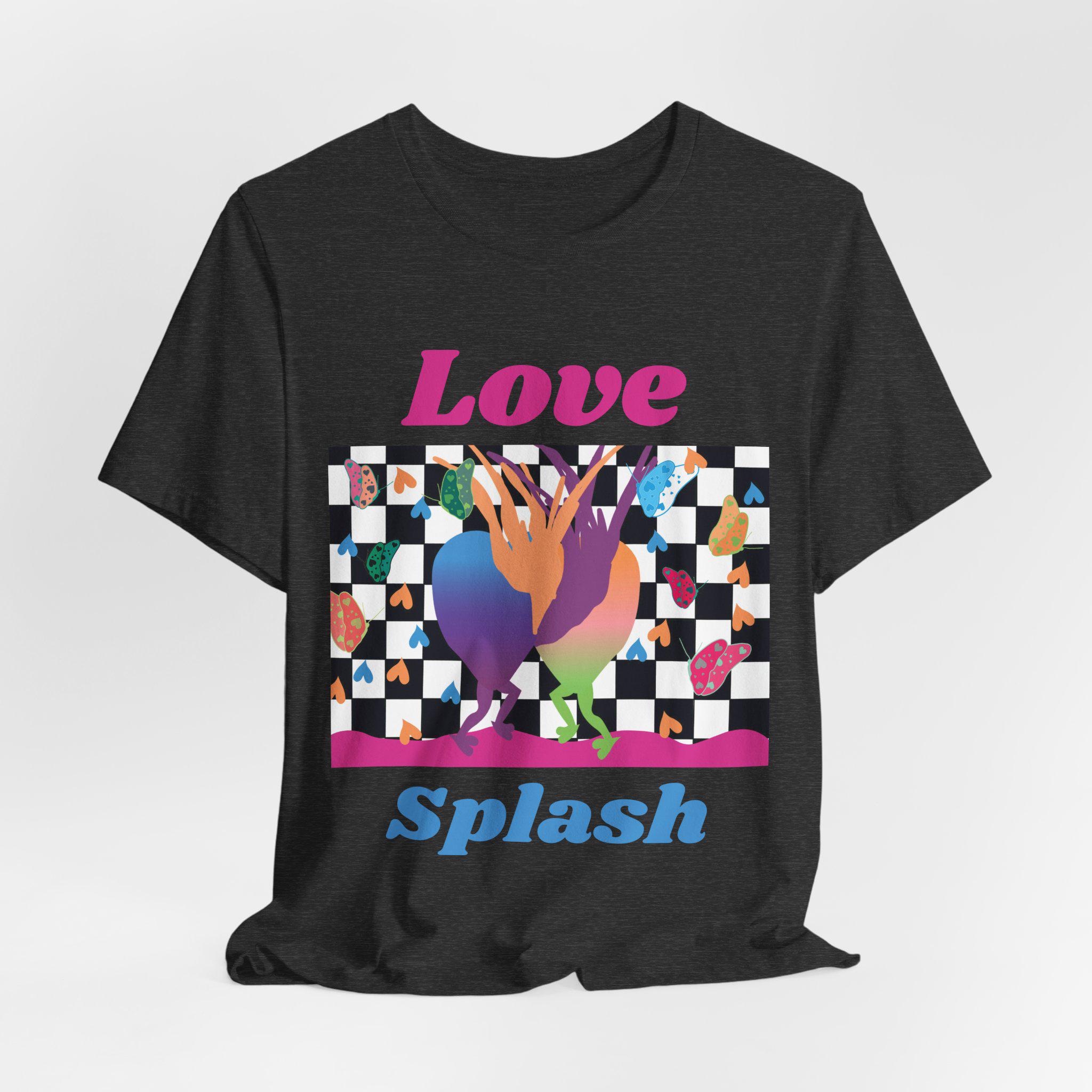This lightweight cotton tee carries a retro-meets-surf energy — bright, playful, and unapologetically joyful. A checkerboard backdrop frames a colorful sunset orb and a stylized diver, while lively floral and wave motifs peek through the squares. ‘Love’ arches above in warm pink and ‘Splash’ anchors the design in cool blue, giving the shirt a nostalgic summer vibe. Wear it to add an easy, expressive layer to beach days, music fests, or weekend hangs — it reads like a warm memory come to life: sun on skin, salt on the breeze, and that small rush of something carefree.
