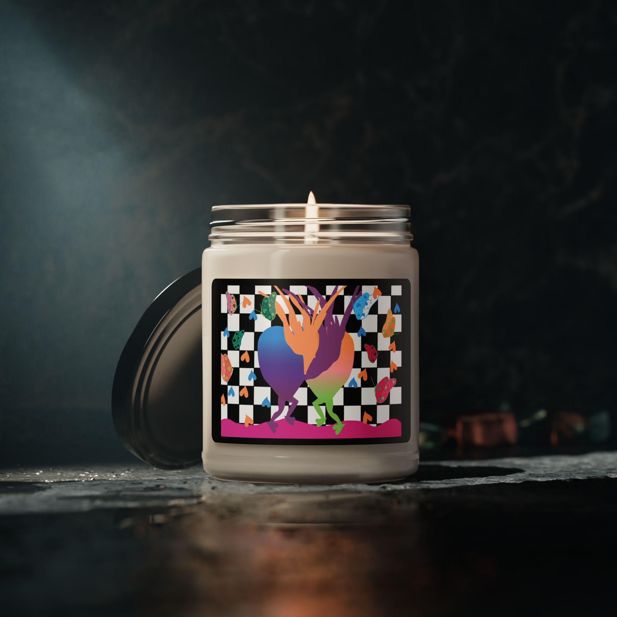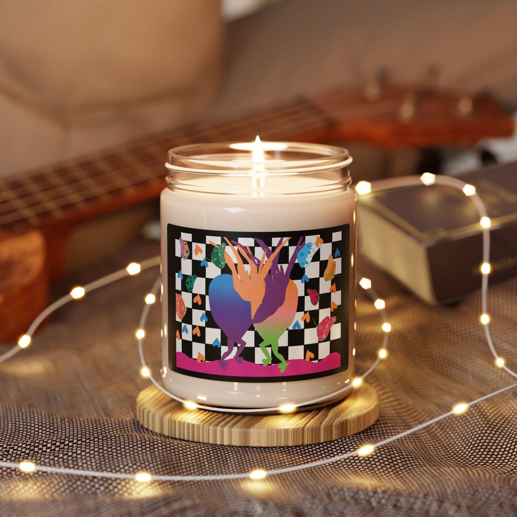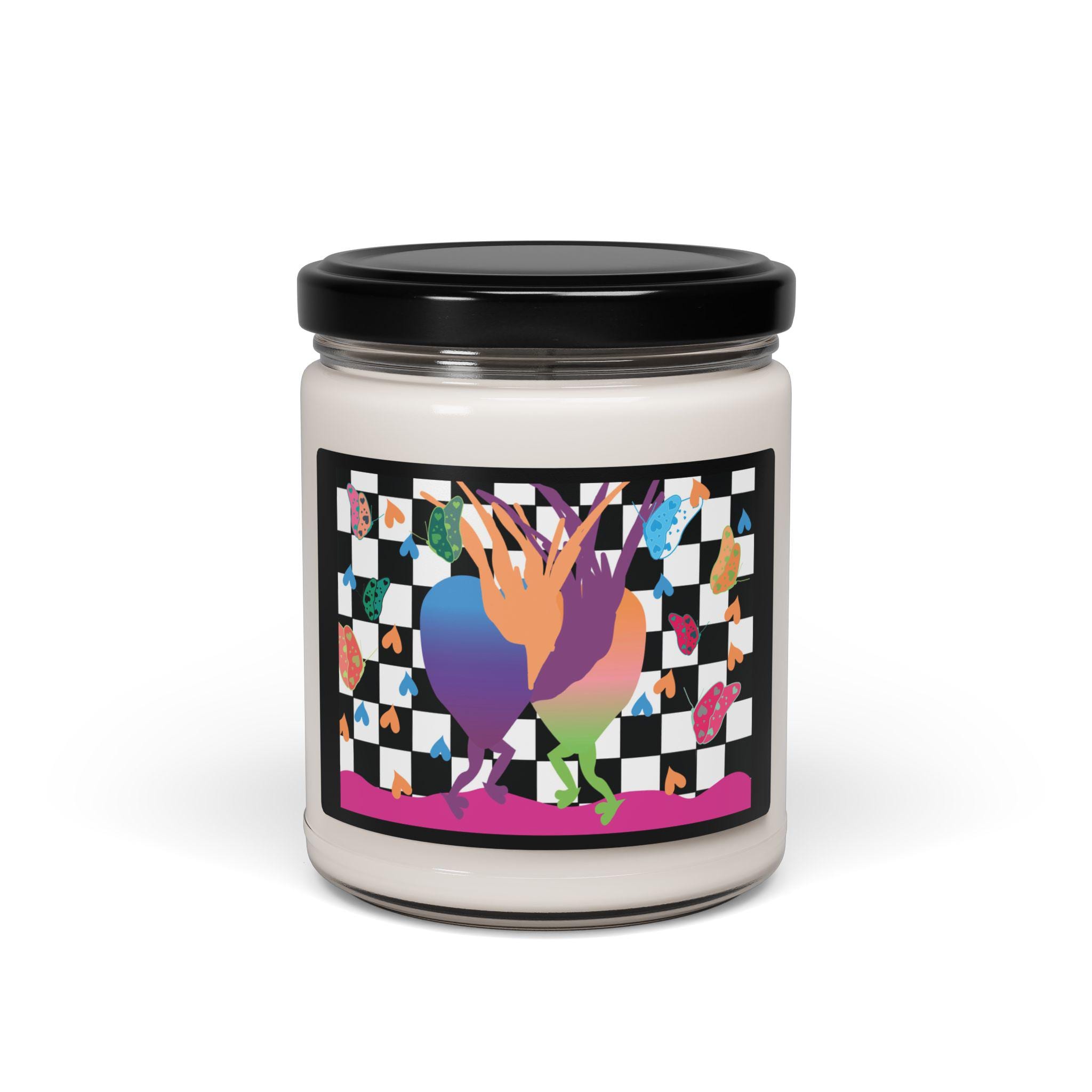 Hand-poured 9 oz soy candle in a reusable glass jar, wrapped with a vibrant, artful label that blends playful color and a modern checker motif. Each candle burns cleanly for 50–60 hours on a 100% cotton wick and is made from a natural soy wax blend with carefully chosen fragrance blends and essential oils. Light it to bring a layered, nostalgic warmth or a bright coastal clarity to your room—then wash and repurpose the jar as a small planter, pencil cup, or bedside catchall. Assembled in the USA and finished with a glossy permanent label that keeps the lively design vivid through everyday use.