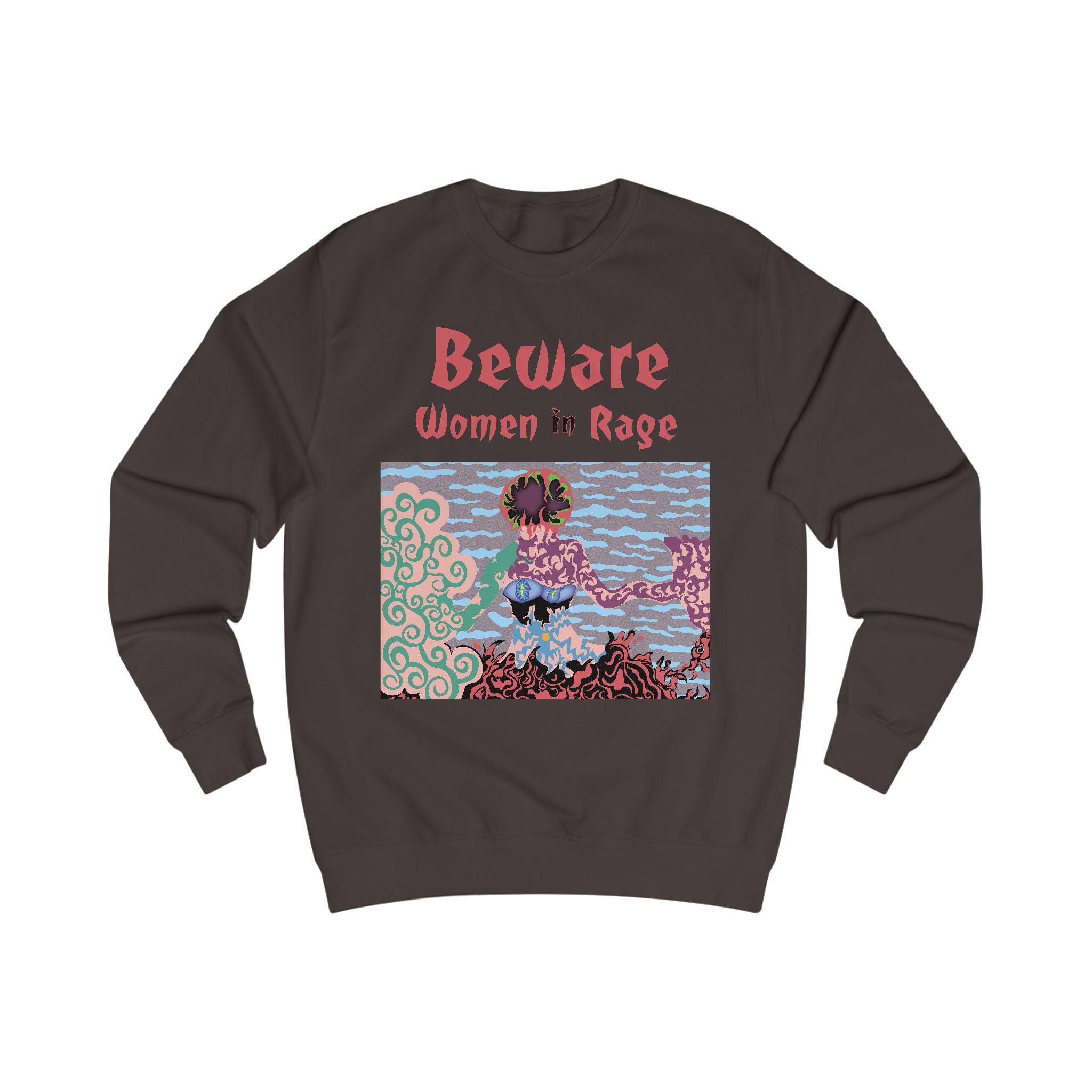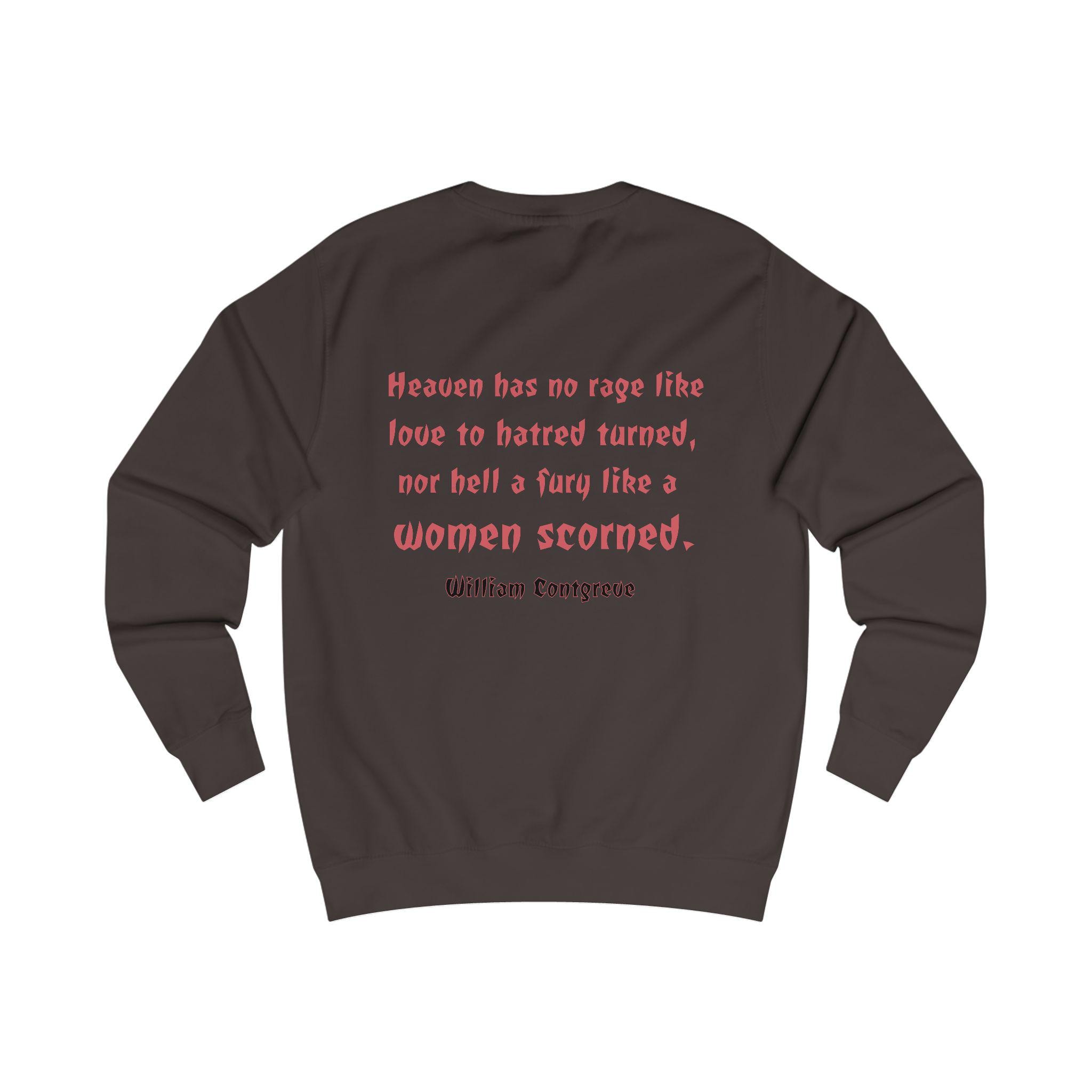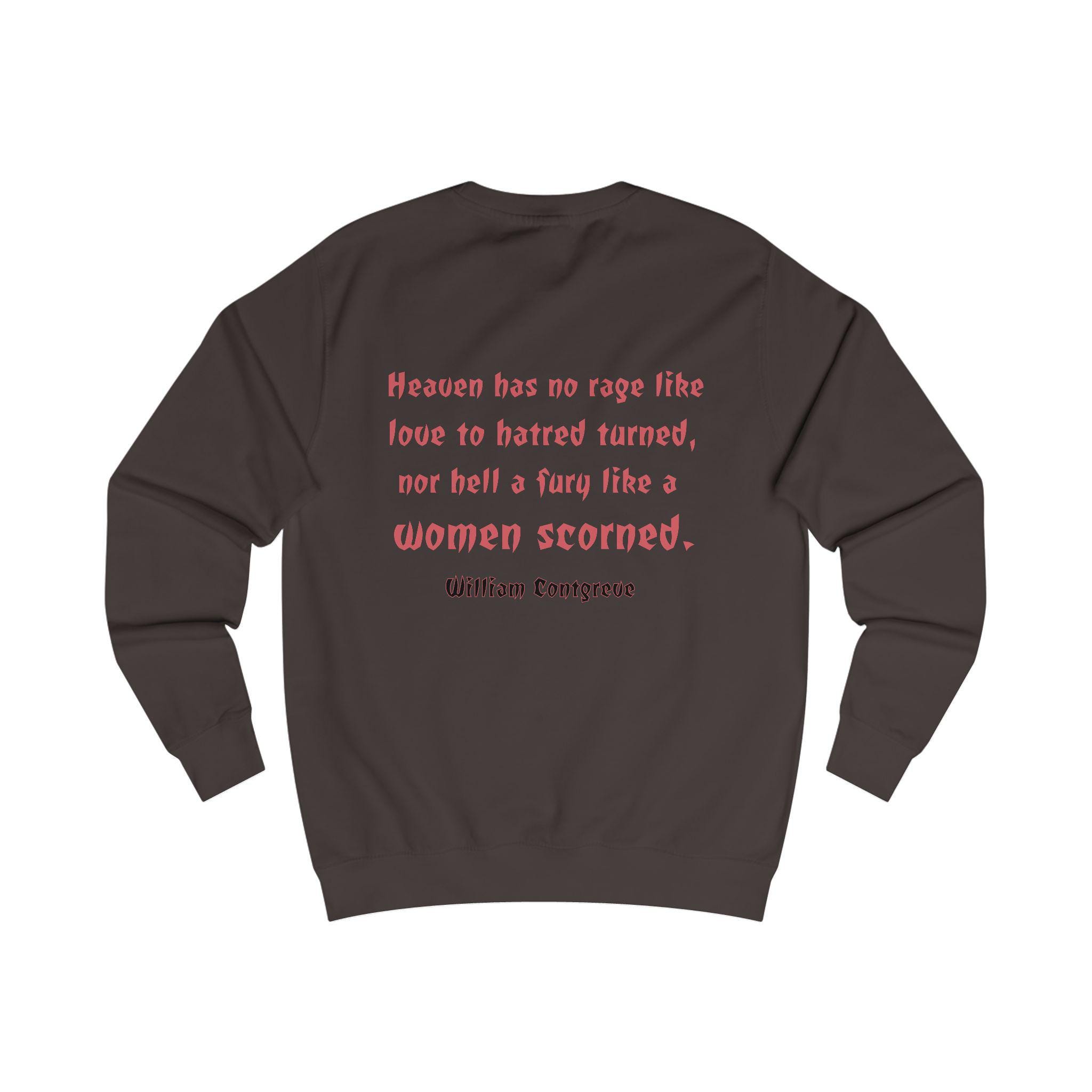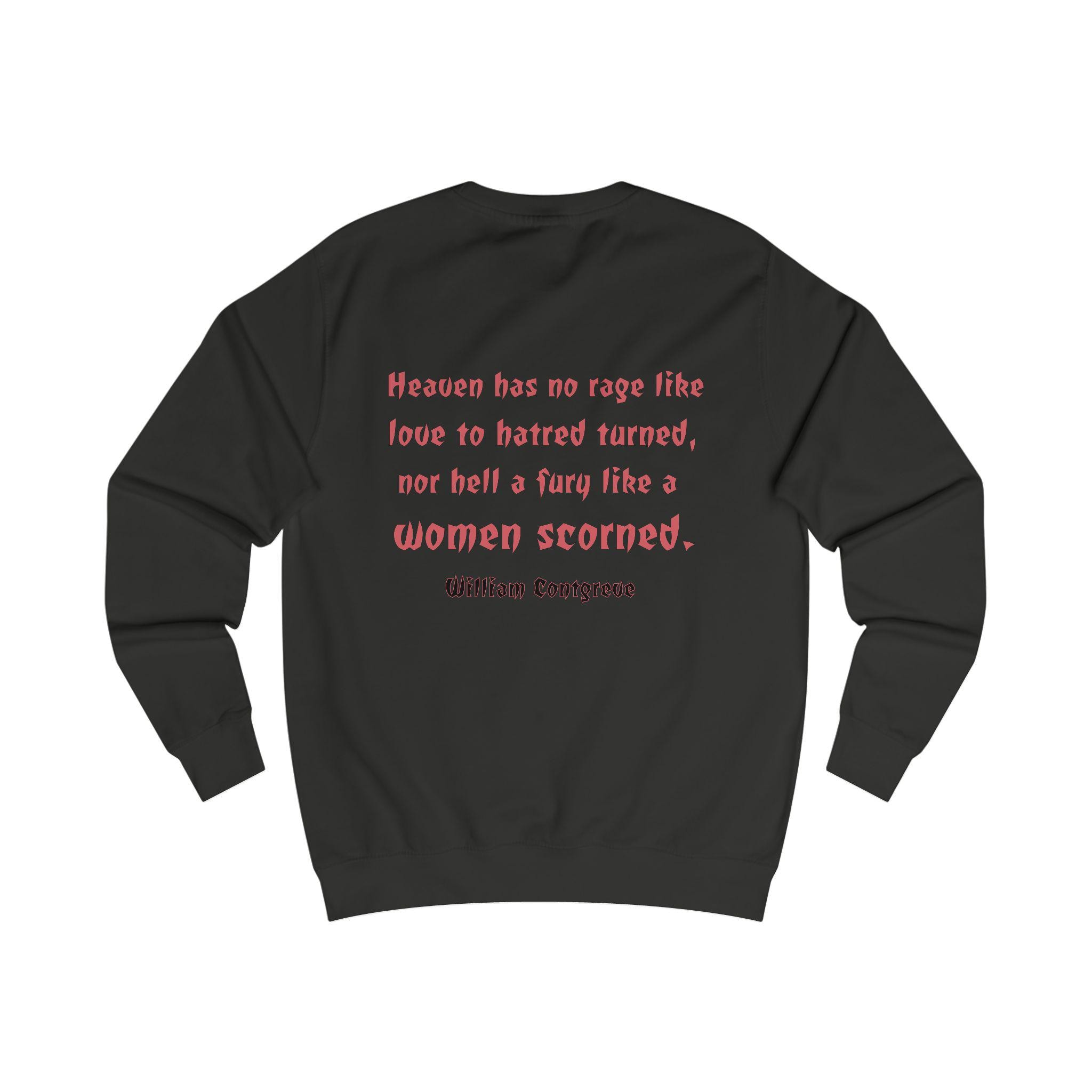 This sweatshirt channels a bold, vintage-inspired statement with a handcrafted, artful edge. The front features a stylized illustration framed by decorative waves and clouds, topped with the striking title “Beware Women in Rage.” On the back a classic quote—“Heaven has no rage like love to hatred turned; nor hell a fury like a woman scorned.” —William Congreve—is printed in a matching typeface, so the message reads like an old-world proclamation reimagined for modern wardrobes. The garment’s heavier midweight fabric and structured side seams give it a grounded, durable feel that wears well across seasons. It’s the kind of sweater someone reaches for when they want to make a clear, thoughtful statement while staying cozy: great layered over a tee or under a jacket during chilly outings, protests, or nights out with friends who appreciate feminist literature and retro visuals. The artwork and typography nod to vintage print culture, speaking to listeners of poetry, fans of femme-centered activism, and anyone who loves clothing with a literary backbone.